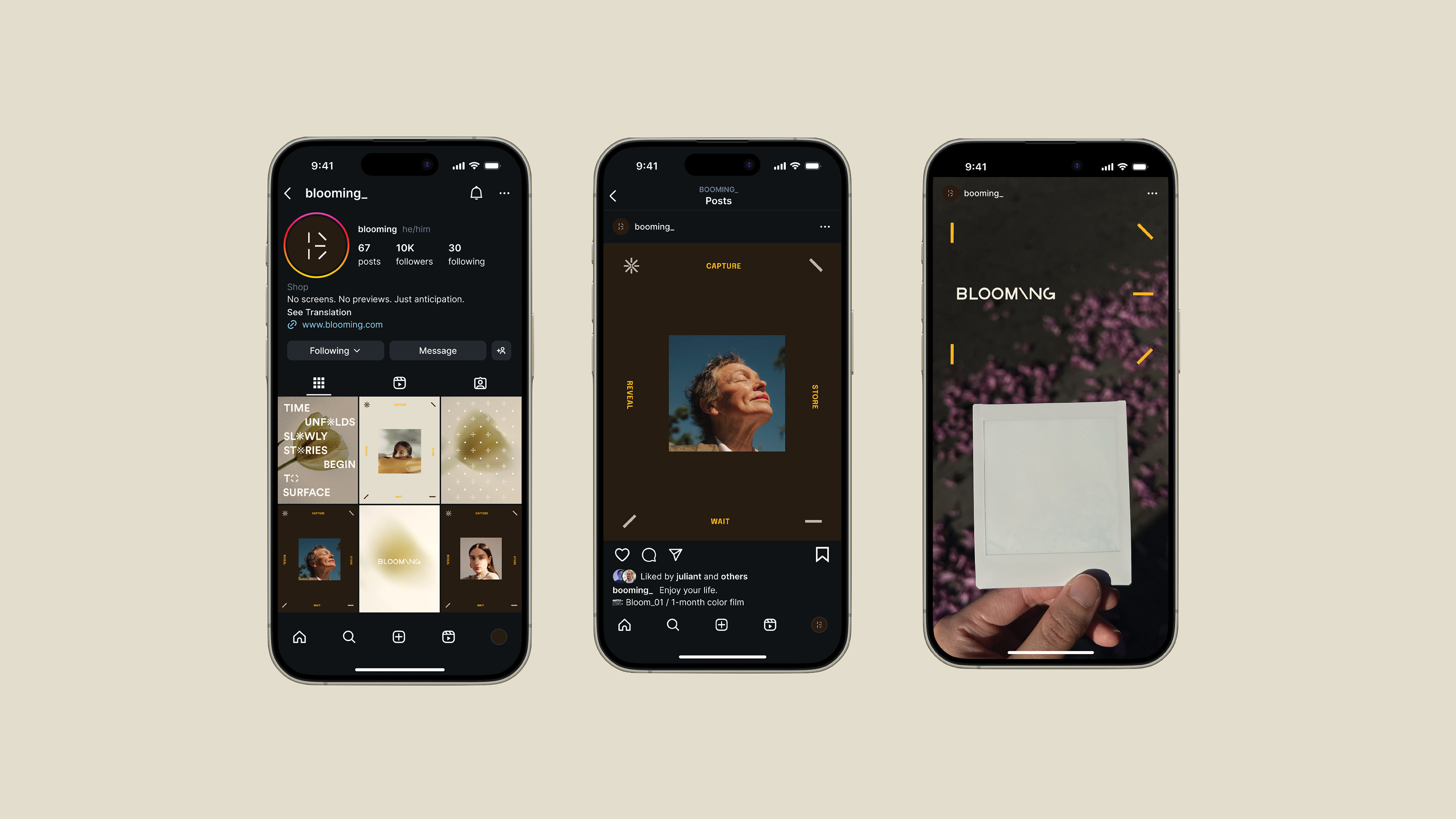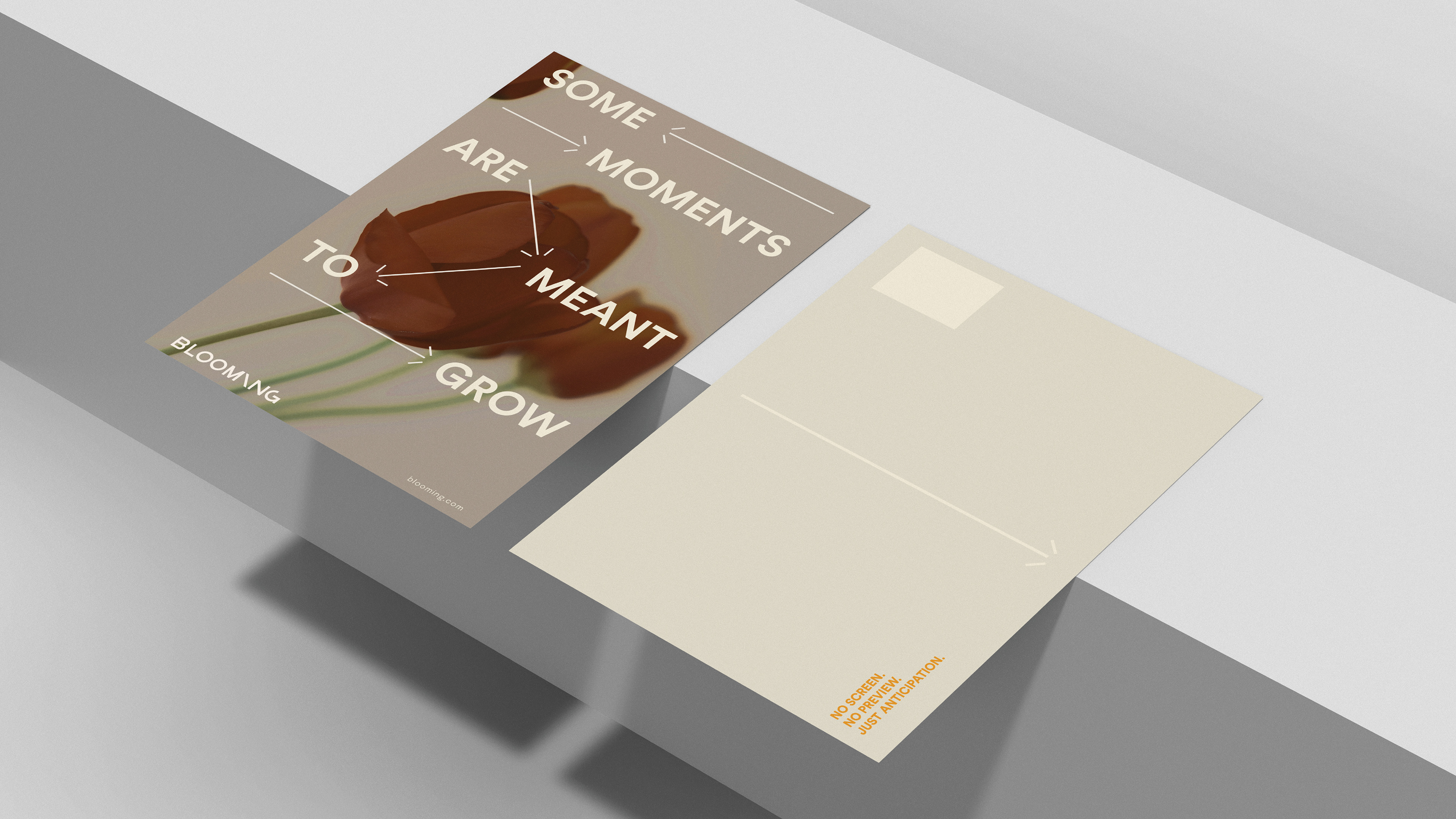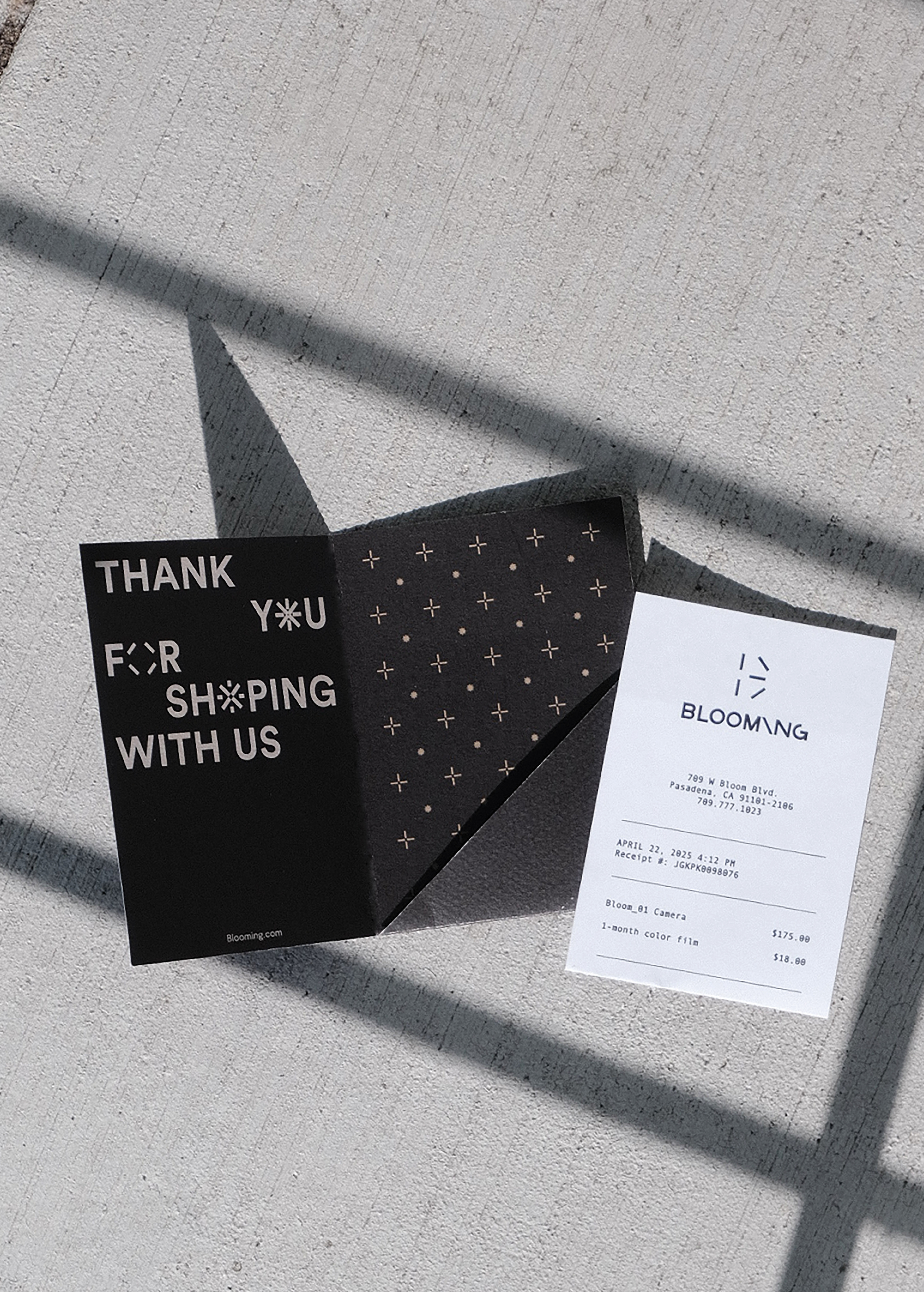 Blooming is a camera that delays the reveal of your photos, transforming the act of capturing into a ritual of patience and rediscovery. Designed for a slower, more intentional world, Blooming invites users to step away from instant gratification and reconnect with memory over time. The brand identity expresses this emotional journey through soft, nostalgic colors, a flowing logomark, and layered packaging that mirrors the experience of waiting—revealing moments gradually, like a flower in bloom.